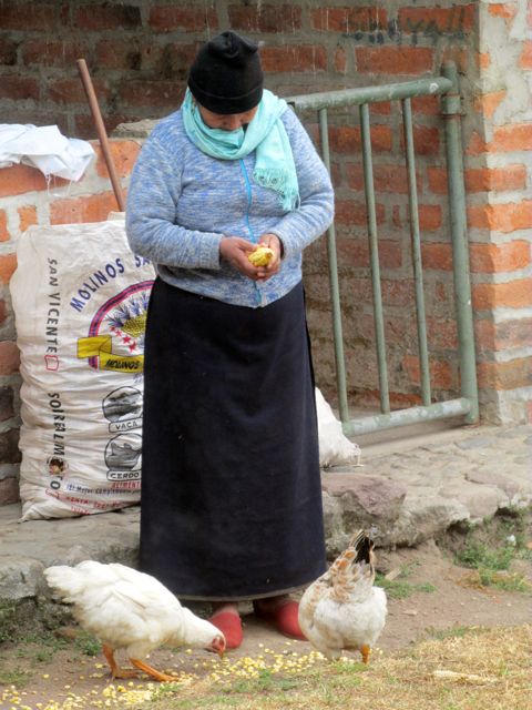 | Rosita feeding the chickens - by rubbing kernels off the cob. |